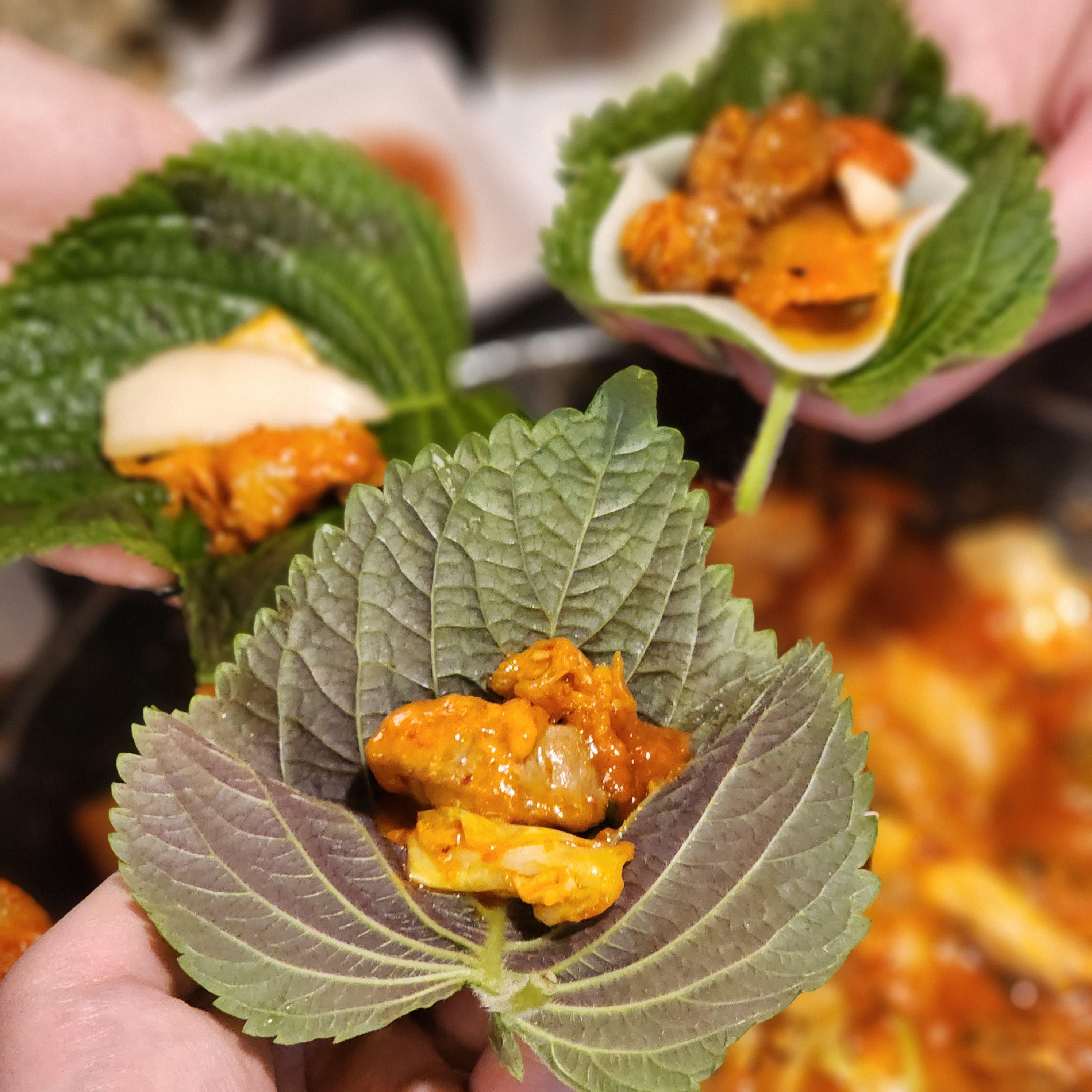 깻잎하고 완전 잘 어울리고 ㅜㅜ 치즈 땜에 고소하고 원래 소스가 매콤하고 저는 매운걸 잘 못먹는데 적당히 매콤하고